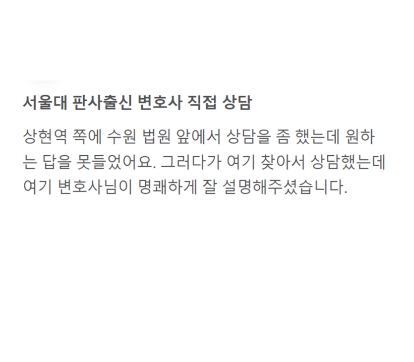 상현역 쪽에 수원 법원 앞에서 상담을 좀 했는데 원하는 답을 못들었어요. 그러다가 여기 찾아서 상담했는데 여기 변호사님이 명쾌하게 잘 설명해주셨습니다.