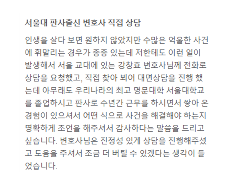 인생을 살다 보면 원하지 않았지만 수많은 억울한 사건에 휘말리는 경우가 종종 있는데 저한테도 이런 일이 발생해서 서울 교대에 있는 강창효 변호사님께 전화로 상담을 요청했고, 직접 찾아 뵈어 대면상담을 진행 했는데 아무래도 우리나라의 최고 명문대학 서울대학교를 졸업하시고 판사로 수년간 근무를 하시면서 쌓아 온 경험이 있으셔서 어떤 식으로 사건을 해결해야 하는지 명확하게 조언을 해주셔서 감사하다는 말씀을 드리고 싶습니다. 변호사님은 진정성 있게 상담을 진행해주셨고 도움을 주셔서 조금 더 버틸 수 있겠다는 생각이 들었습니다.