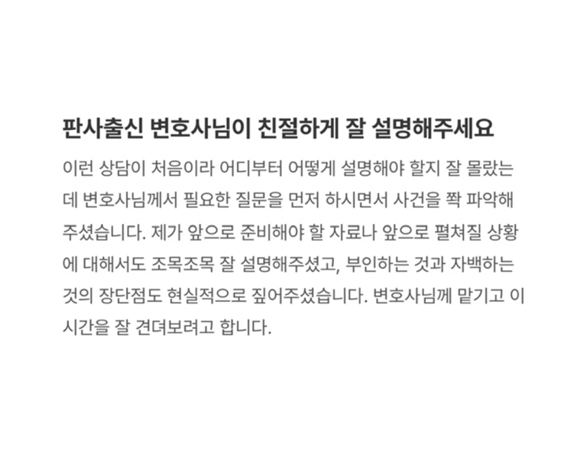 제가 앞으로 준비해야 할 자료나 앞으로 펼쳐질 상황에 대해서도 조목조목 잘 설명해주셨고, 부인하는 것과 자백하는 것의 장단점도 현실적으로 짚어주셨습니다. 변호사님께 맡기고 이 시간을 잘 견뎌보려고 합니다.